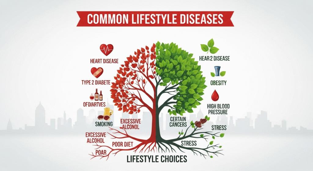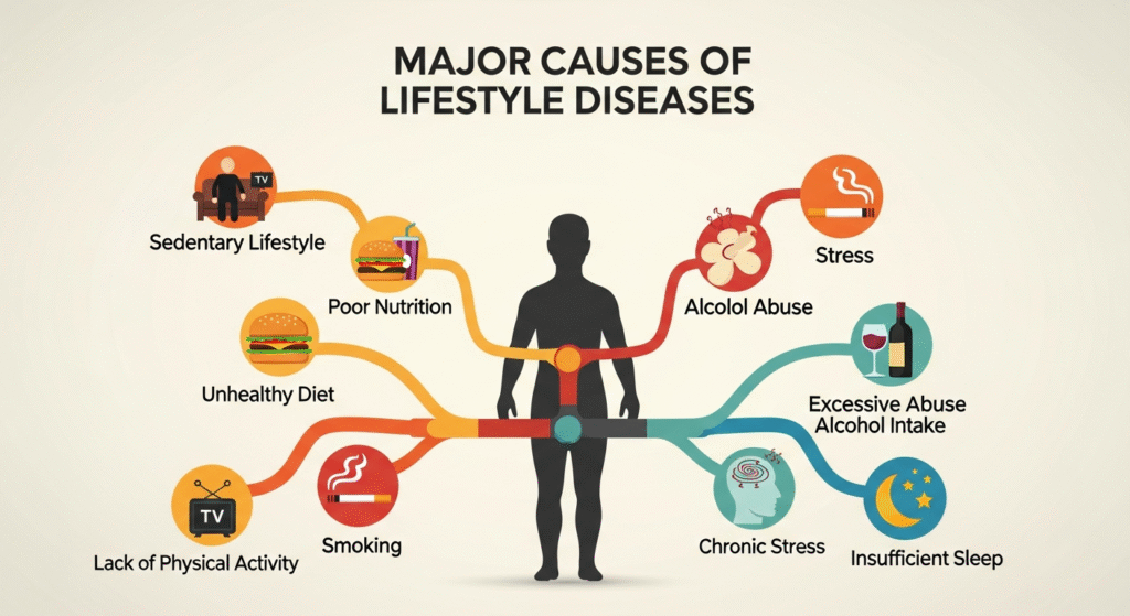 Lifestyle diseases are health conditions that develop gradually over time due to the daily habits and choices we make. Unlike infectious diseases, which are caused by bacteria or viruses and spread from person to person, lifestyle diseases occur because of unhealthy behaviors, poor diet, lack of exercise, stress, and harmful addictions. These diseases are closely linked to modern living, busy routines, and increasing dependence on technology.