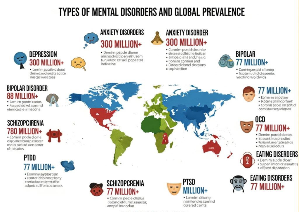 Mental disorders are medical conditions that affect a person’s thinking, emotions, behavior, or ability to function in daily life. They are not caused by personal weakness but by changes in the brain, genetics, stress, or trauma.