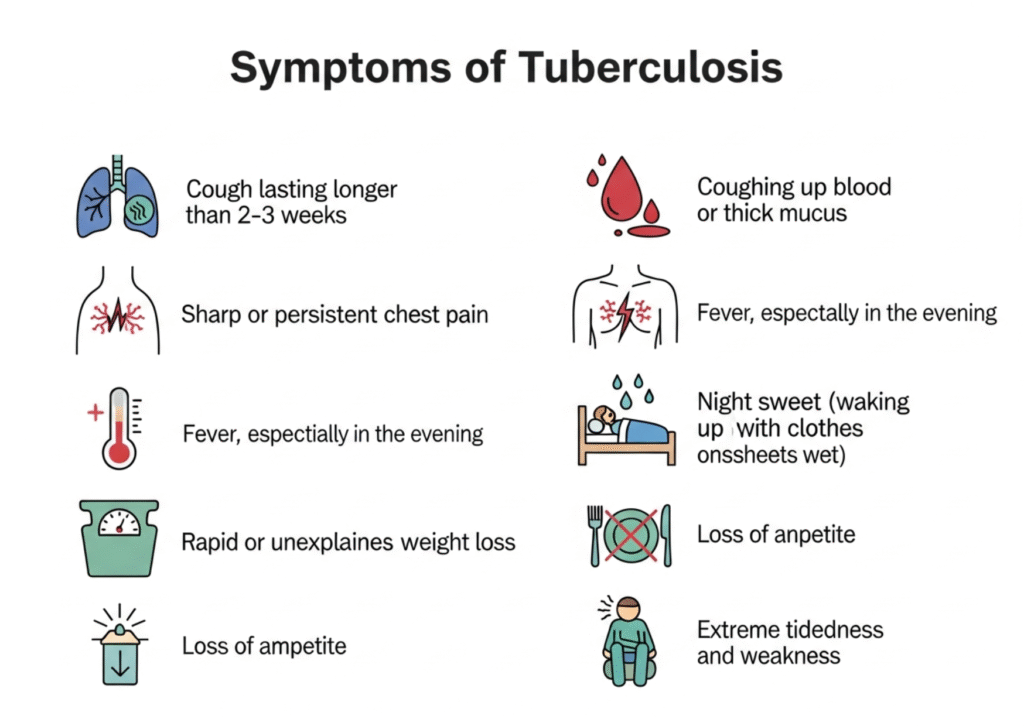TB symptoms may start slowly and can be mistakenly ignored. Early detection is very important.