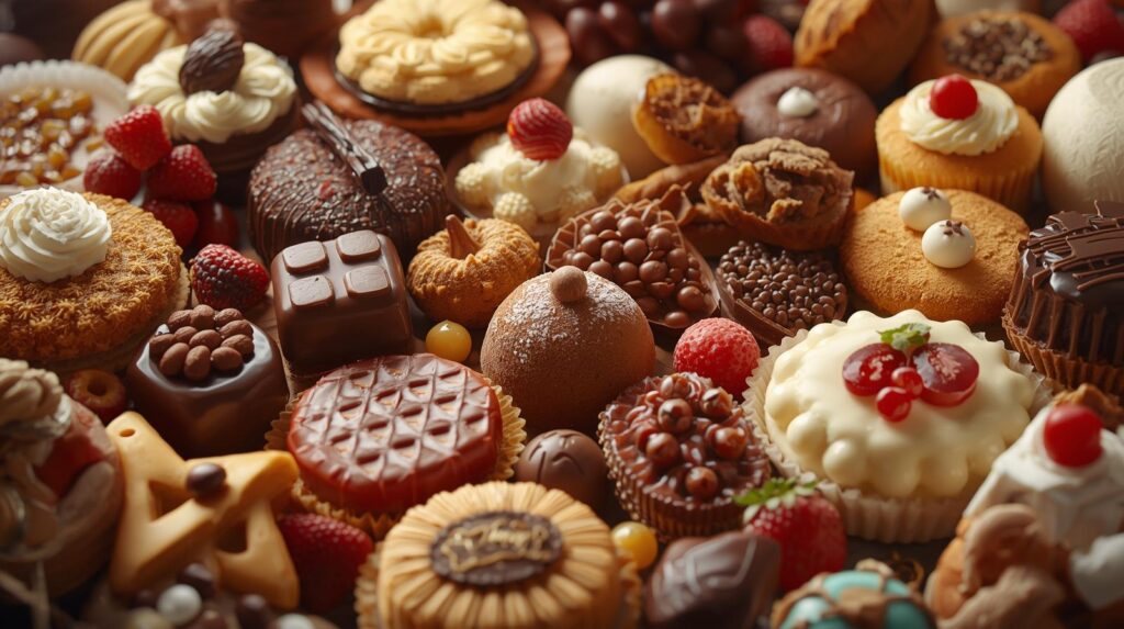 Examples: Cakes, pastries, doughnuts, candies, chocolate bars